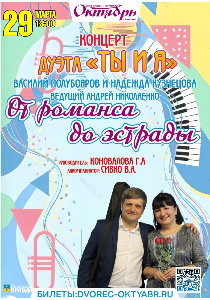 Концерт дуэта Н. Кузнецовой и В. Полубоярова "От романса до эстрады"29 марта в 13.00.