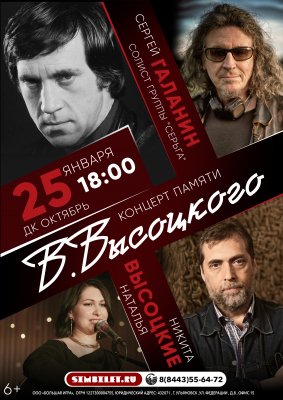Концерт памяти Владимира Высоцкого — в Волжском! 25 января 2026 ЦКиИ «Октябрь», г. Волжский Начало в 18:00 25 января 2026 года в ЦКиИ «Октябрь» состоится уникальное музыкально-театральное событие, посвящённое жизни и творчеству Владимира Семёновича Высоцкого — поэта, актёра, барда, чьи слова и песни навсегда остались в сердцах миллионов.