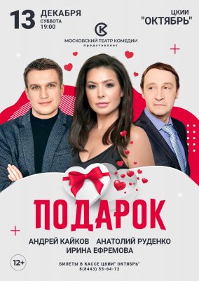 Спектакль "Подарок" 13 декабря 19:00 Сцена на протяжении спектакля становится удивительным местом – здесь рождается и умирает любовь. Трудно предугадать, чем закончится та или иная история – они непредсказуемы. Разные по стилю и настроению новеллы Валентина Красногорова объединены общей темой непростых отношений внутри любовной пары. Вместе с героями зритель ищет ответы на глубокие, злободневные вопросы. В новелле “Подарок”, - любовники, изо всех сил стараются скрыть свои отношения, и их редкие встречи комичны до абсурда, потому что страх быть уличенными в измене, гораздо сильнее тайной страсти.Мы, люди, не являемся совершенствами. Нами часто овладевают страсти и искушения. Способны ли мы устоять перед охватывающим нас желанием?Насколько мы дорожим и ценим тех, кто с нами рядом? Легкие диалоги, парадоксальные сюжеты, комедийные, почти фарсовые ситуации и вместе с тем глубокий лиризм будут держать зрителей в постоянном напряжении до последних мгновений спектакля. Актерский состав: Анатолий Руденко Андрей Кайков Ирина Ефремова Автор пьесы – Валентин Красногоров Режиссер спектакля – Эдуард Радзюкевич Ограничение: 12+ Продолжительность: 1 час 40 минут (с антрактом)