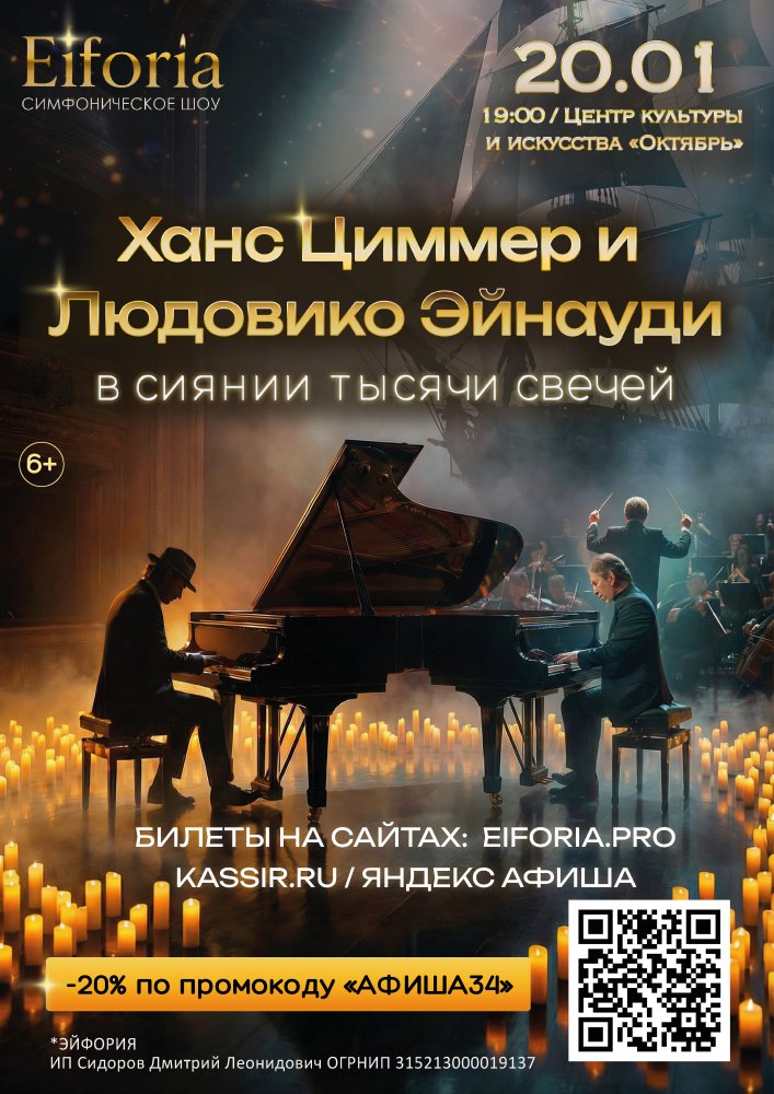20 января 2026 19:00 Уникальное событие ожидает поклонников прекрасной музыки! Вас ждёт потрясающий концерт в честь одних из самых популярных композиторов современности –Ханса Циммера и Людовико Эйнауди. Знаменитые мелодии из легендарных кинофильмов «Интерстеллар», «Пираты Карибского моря», «1+1», «Долгая дорога на юг», «Номадленд» прозвучат в неповторимом звучании живого симфонического оркестра. Эти музыкальные темы, написанные с душой и любовью, подарят слушателям новые впечатления и вдохновение. Благодаря великолепному исполнению музыкантов и особым декорациям из множества свечей, сцена преобразится в волшебное пространство, полное нежности и романтики.