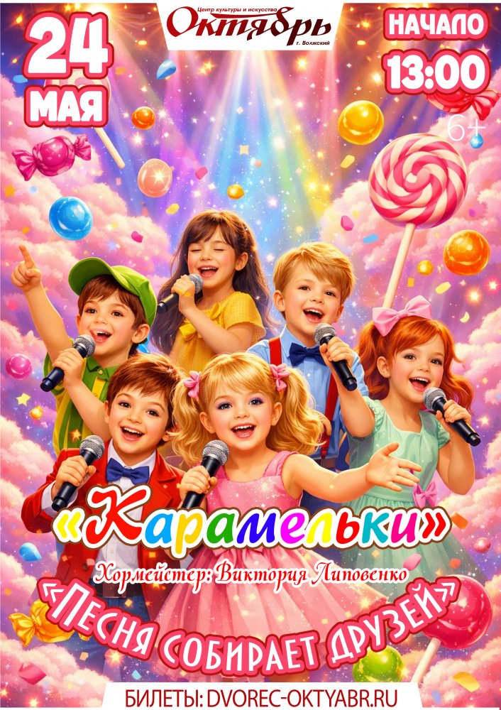 24 мая 2026г. 18.00. «Песня собирает друзей» Образцовая художественная студия эстрадной песни «Карамельки» подарит волжанам настоящий праздник музыки — искренний, теплый и наполненный детской энергией! Прозвучат любимые песни, которые найдут отклик в каждом сердце, подарят улыбки и сделают зрителей счастливее! Музыка объединит друзей и наполнит зал солнечным настроением!