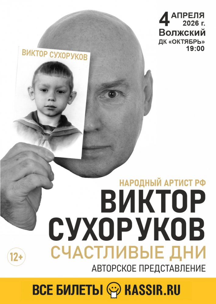 4 апреля 2026г. 19:00 В гостях в вашем городе будет один из самых удивительных, темпераментных и харизматичных актеров современного театра и кинематографа — народный артист России Виктор Сухоруков, куда он приезжает с авторским представлением «Счастливые дни». Его имя – синоним творческой неуспокоенности, работоспособности, человеческой и актерской открытости. О нем хочется говорить только в превосходной степени: талантливейший, популярнейший, многоликий, неутомимый. Одним словом - человек-оркестр. Что может вдохновить такого известного актера на создание творческого вечера? Для Виктора Сухорукова таким поводом послужило посещение дома-музея Юлиана Семенова в Севастополе, стены которого увешаны фотографиями с автографами известных людей. Так родился этот вечер одного актера. Как монолог о людях. О встречах и невстречах, о дружбе и предательстве, о горе и радости. И, конечно, о любви и преданности. Виктор Сухоруков признается, что осуществил свои детские мечты. И пусть путь был нелегок и тернист, но главное, что он шел по нему сам. Плутал, ошибался, преодолевал крутые повороты, но он жил и продолжает жить собственной жизнью, не завидуя и не унывая. Вечер с Виктором Сухоруковым - это история жизни человека театра в воспоминаниях, фотографиях и автографах. Это подарок не только поклонникам актера, но и всем любителям театра. «Счастливые дни» — это история жизни автора в воспоминаниях, монолог о призвании, мечтах, любви и благодарности. Режиссёр-постановщик — народный артист РФ Виктор Сухоруков Продолжительность 1 час 40 минут без антракта