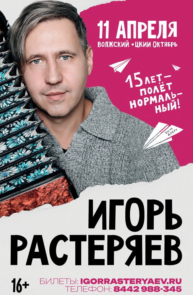 Вот уже 15 лет «музыкальный комбайн» Игоря Растеряева бороздит необъятные просторы нашей Родины, даря людям тепло своего душевного творчества; вызывая счастливые улыбки, а порой – трогательные слёзы. Юбилейный концерт в Волжском пройдёт в рамках масштабного гастрольного тура с красноречивым названием «15 лет – полёт нормальный», который станет особенным не только для поклонников, но и для него самого.